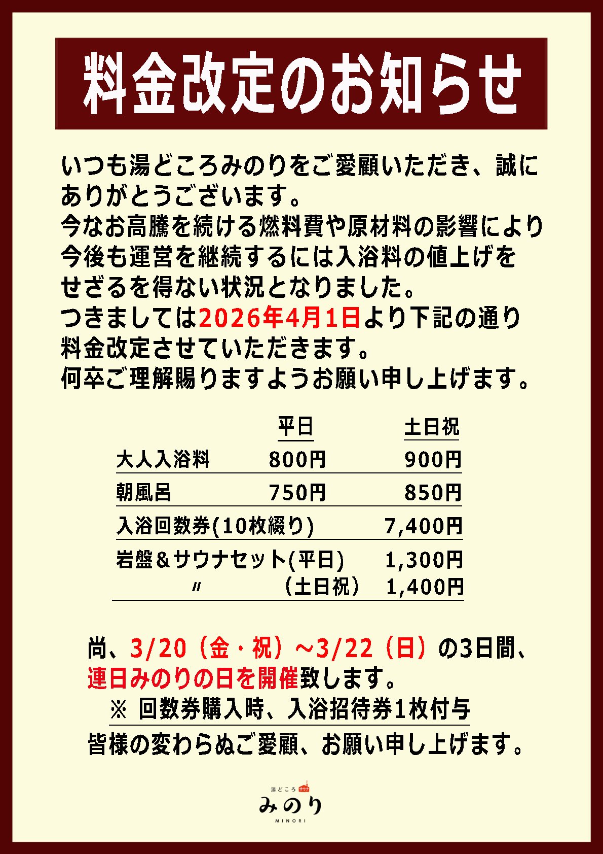 入浴料金改定のお知らせ